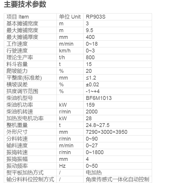 RP903S型瀝青混凝土攤鋪機是根據產品市場需求,以及我公司的攤鋪機現狀開發(fā)的一款9米高端大型攤鋪機,是與德國VOGELE S2100-3、S1880-3為同一技術檔次產品,在部分技術上還處于領先的地位,主要適用于攤鋪瀝青混泥土面層施工,其最大攤鋪寬度可達9.5米,是高等級公路建設中重要的施工設備。