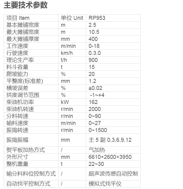 RP953型多功能攤鋪機是3系列大型攤鋪機中重要的機型之一,具有可靠的品質(zhì),超強的施工能力,優(yōu)異的工作性能和較高的性價比,是一種可廣發(fā)應(yīng)用于高速公路基礎(chǔ)和各種等級公路面層材料攤鋪作業(yè)的施工設(shè)備。該機采用全液壓驅(qū)動,微電腦控制,作業(yè)獨立驅(qū)動,超聲波料位傳感控制,電子自動找平,雙振搗壓實等當(dāng)今世界最先進技術(shù),使得該機具有作業(yè)能力強,攤鋪穩(wěn)定性好,供料均勻,預(yù)壓密實高度,路面平整度好,操作簡單舒適,維修方便快捷等優(yōu)點。