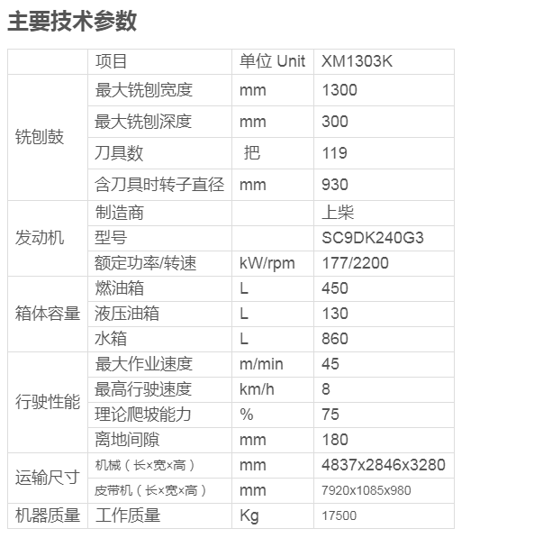 XM1303K是一款具有高性能的一米三銑刨機(jī),主要用于公路、城鎮(zhèn)道路、機(jī)場(chǎng)、貨場(chǎng)、停車場(chǎng)等瀝青混凝土面層的開挖翻新。可以高效低清除路面癰包、油浪、網(wǎng)紋、車轍等;亦可開挖路面坑槽及溝槽;還可用于水泥路面的拉毛及面層錯(cuò)臺(tái)的銑平。該設(shè)備工作效率高,施工工藝劍達(dá),銑刨深度易于控制,操作方便靈活,機(jī)動(dòng)性能好,銑刨的舊料能直接回收利用,可廣泛地用于瀝青路面的維修翻新養(yǎng)護(hù)施工之中。